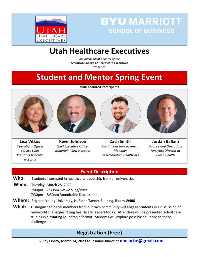 UHE is thrilled to announce an upcoming Student and Mentor Spring Event with Utah Healthcare Executives, and it is open to all students across Utah. You do not need to be a Utah Healthcare Executives member to attend.